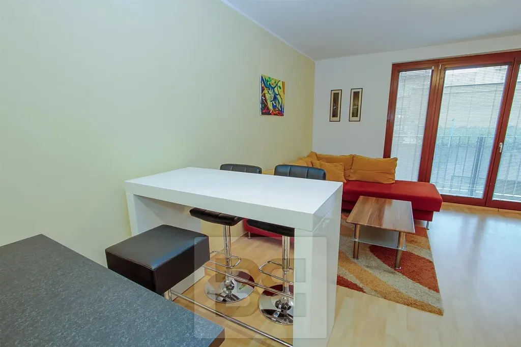 Tento pěkný, dobře řešený byt se skládá z předsíně, obývacího pokoje s kuchyňským koutem včetně vestavěných spotřebičů (lednice s mrazákem, sklokeramická varná deska, horkovzdušná trouba, myčka nádobí, digestoř), ložnice, koupelny a odděleného WC. Obě místnosti disponují velkými francouzskými okny. Součástí vybavení je veškerý nábytek a spotřebiče dle fotografií.