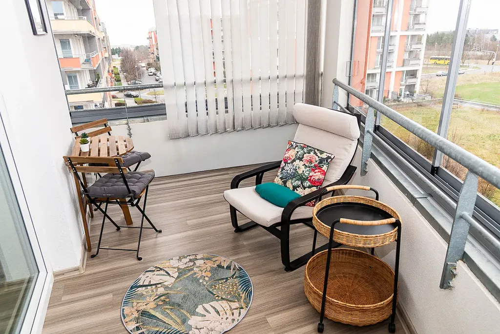 Byt o užitné ploše 65,5m² nabízí prostorný obývací pokoj (26,7 m²) s kuchyňským koutem vybaveným vestavěnými spotřebiči (trouba, varná deska, digestoř, myčka, lednice).