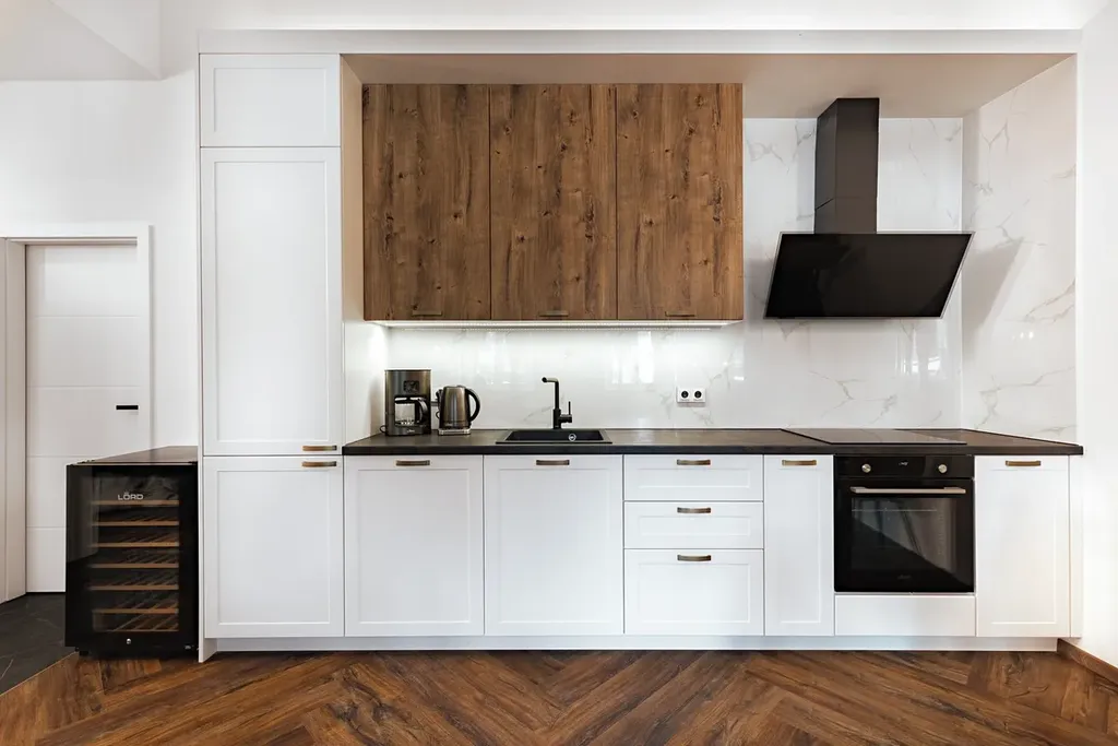 Vybavení: Interiéry v kombinaci moderního a rustikálního stylu, kompletně zařízené kuchyně se spotřebiči LORD a podlahové vytápění. Nábytek dle standardu developera je zahrnut v kupní ceně bytu.