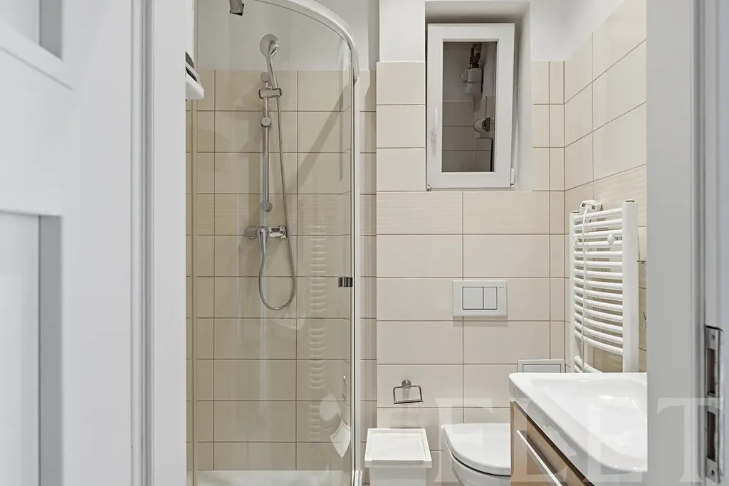 Dispozice nabízí dvě samostatné ložnice a praktické řešení v podobě dvou koupelen – jedna s vanou, druhá se sprchovým koutem.