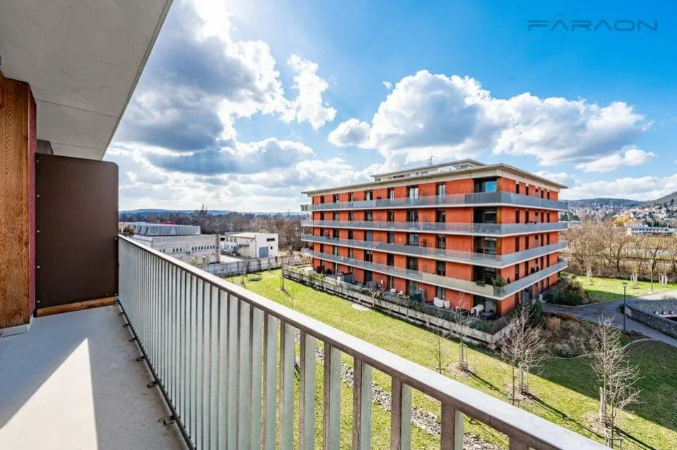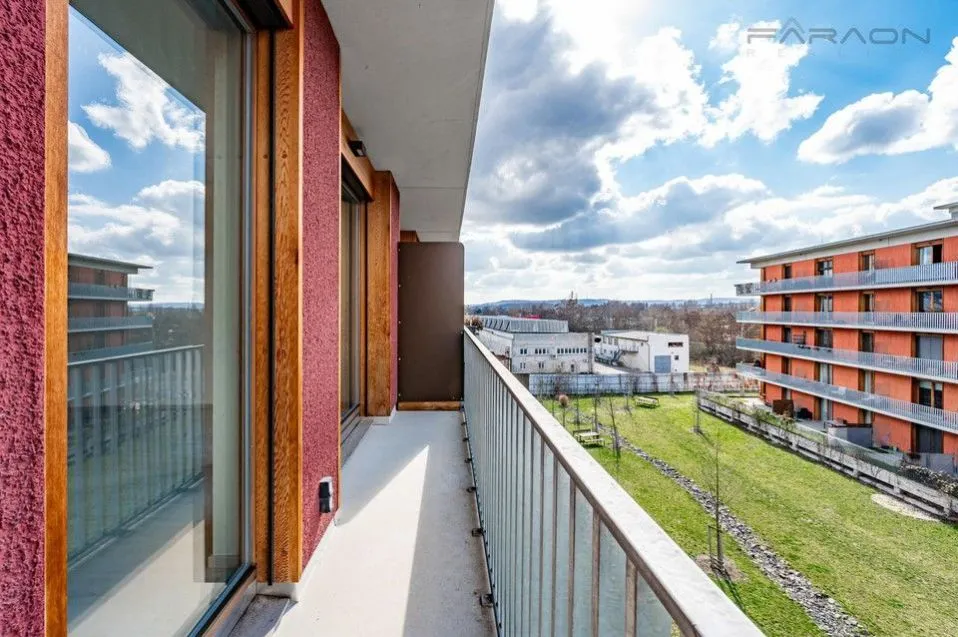 K pronájmu krásný, zcela nový byt 1+kk (38 m2) s balkonem (5 m2) a sklepní kójí na patře s bytem (3 m2), situovaný ve 4. patře rezidenčního projektu Belárie Park II.