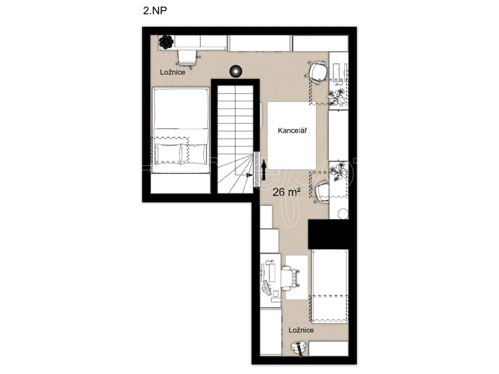 Součástí bytu je také horní prostor o výměře 26 m², který výrazně rozšiřuje možnosti využití bytu a dává mu charakter, který u běžných 2+kk nenajdete. Tento prostor není dle kolaudace veden jako obytná plocha, což je u podobných prostor běžné, a proto jej doporučujeme vnímat jako variabilní zázemí s širokým využitím.