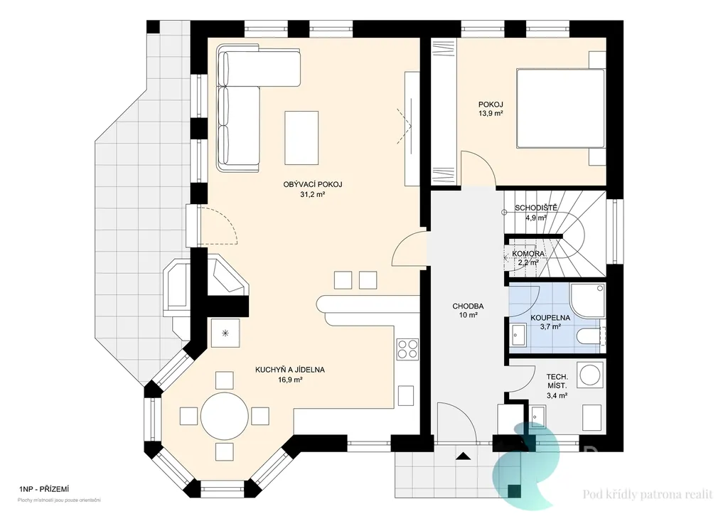 • přízemí: obývací pokoj s krbem, kuchyně, jídelna, pracovna, koupelna, technická místnost, předsíň, spíž
