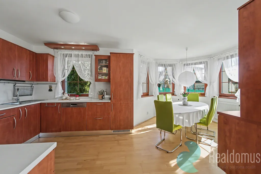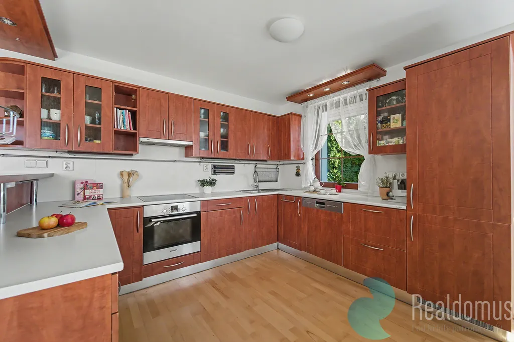Dominantou domu je velkorysá terasa s krbem (25 m²), která plynule propojuje interiér se zahradou a krytým vyhřívaným bazénem (25 m²). V letních měsících terasa poskytuje plnohodnotný obytný prostor pro odpočinek, rodinná setkání i večery s přáteli. Z balkonu v patře i z terasy v přízemí se navíc otevírá krásný výhled do širokého okolí, jakých v Říčanech mnoho nenajdete.