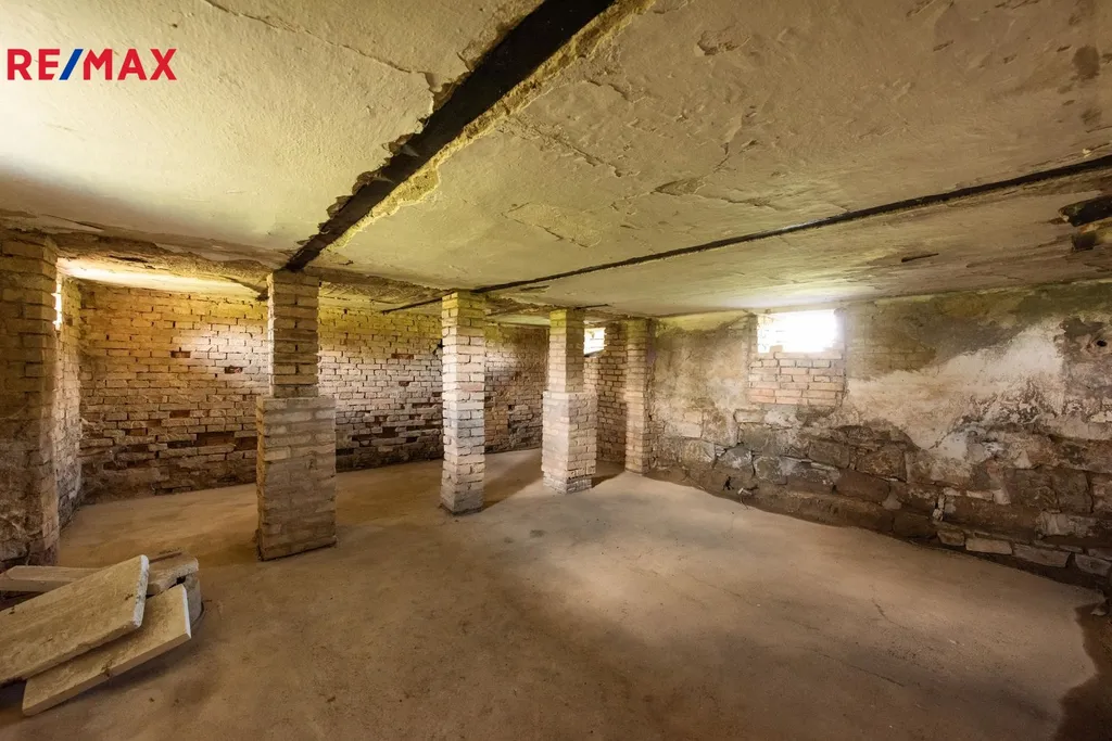 Původní nízké sklepy prohloubeny o 50 cm pro pohodlný pohyb. Podlaha sklepa byla odizolována a pokryta betonem. Stěny cihlové, očištěné a umožňují vybudovat příjemný stylový sklep.