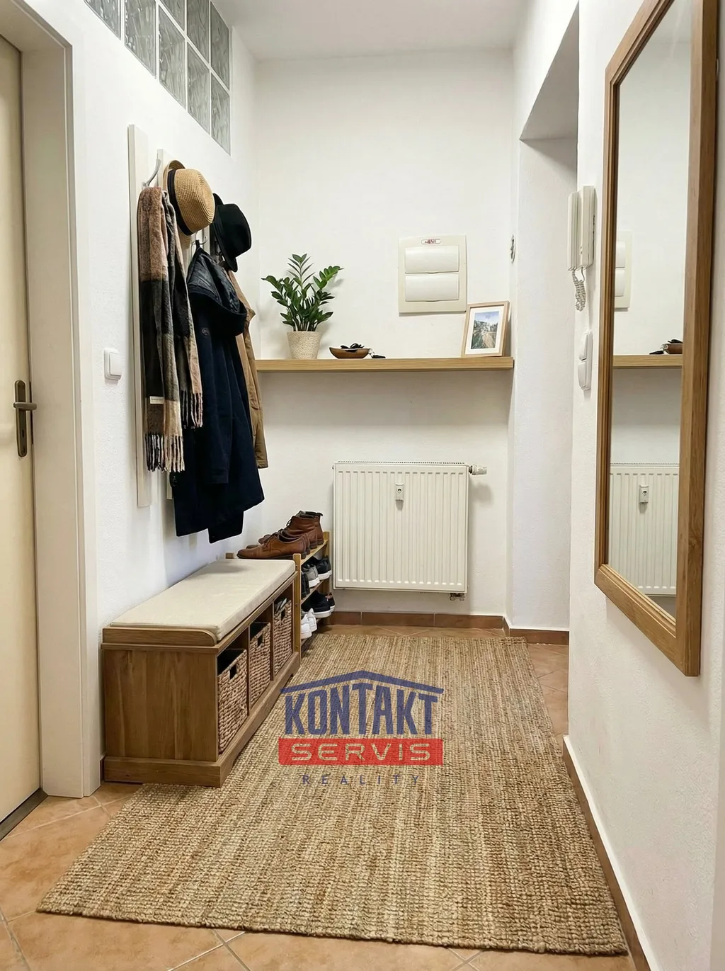 Dispozice zahrnuje vstupní předsíň, koupelnu se sprchovým koutem a místnost s kuchyňskou linkou, která je částečně vybavena. Má otevřený vstup do obývacího pokoje. Z obývacího pokoje vedou schody do podkrovní místnosti, která je využívána jako ložnice. Součástí bytu je také pavlač.