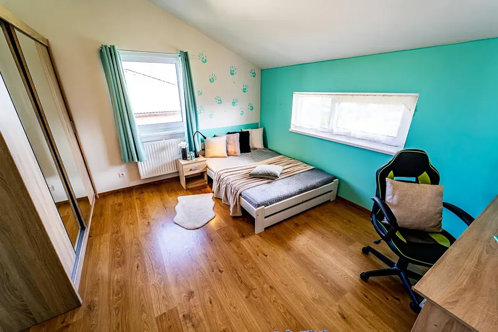 V přízemí se nachází prostorný obývací pokoj propojený s kuchyňským koutem, ložnice, koupelna se sprchovým koutem a vstupní hala. V patře naleznete tři samostatné pokoje, toaletu a koupelnu s vanou.
