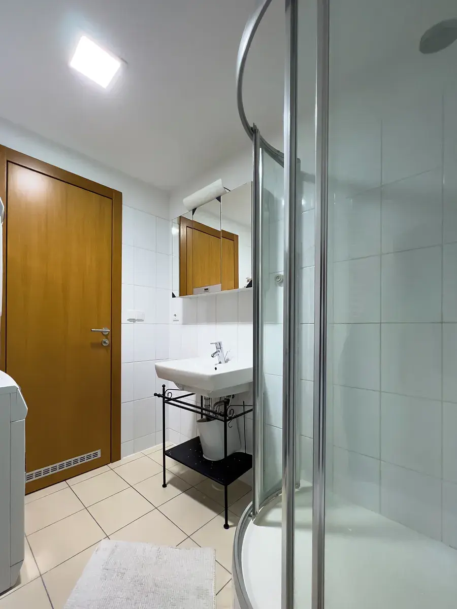 Dispozici tvoří prostorný obývací pokoj (53 m²) s plně vybavenou kuchyňskou linkou s vestavnými spotřebiči a přímým vstupem na velký balkon, který se táhne podél celé délky obývacího pokoje. Dále jsou k dispozici ložnice (19,2 m²) s oddělenou šatnou a druhá ložnice (26,4 m²) s vestavěnou skříní po celé šířce pokoje. Byt dále nabízí předsíň, dvě koupelny a samostatnou toaletu. Standard zahrnuje dřevěné podlahy, dřevěná okna a vestavěné skříně.