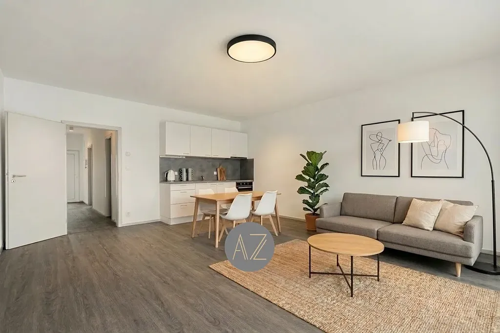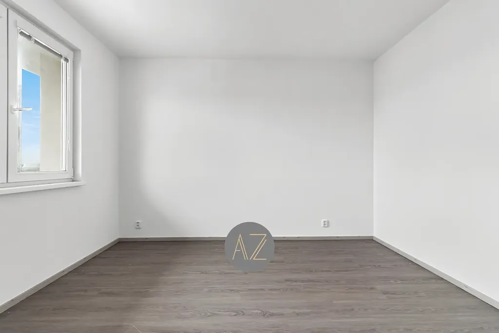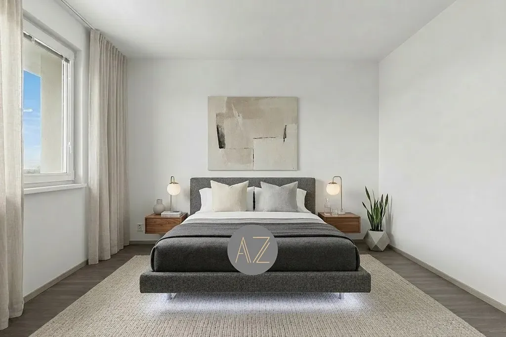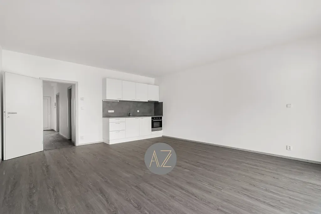 Byt není vybaven. Vizualizace obývacího pokoje s kuchyní a ložnice slouží k lepší představě, jaké množství nábytku lze do místností umístit. Po dohodě lze byt dovybavit chladničkou a pračkou.