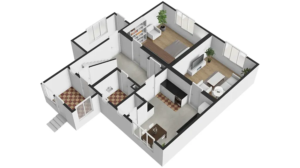 V přízemí se nachází obývací pokoj, kuchyň, ložnice a koupelna s WC, v patře jsou dva pokoje a půda s úložným prostorem. V suterénu jsou technické místnosti a kotelna.