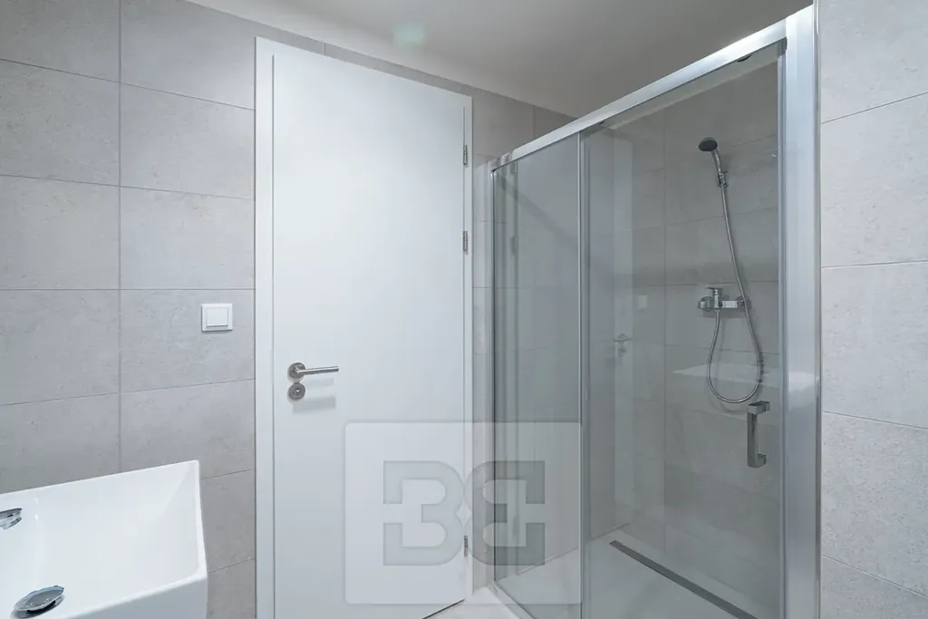 V předsíni najdeme velkou vestavěnou šatní skříň. V koupelně je sprchový kout a toaleta.
