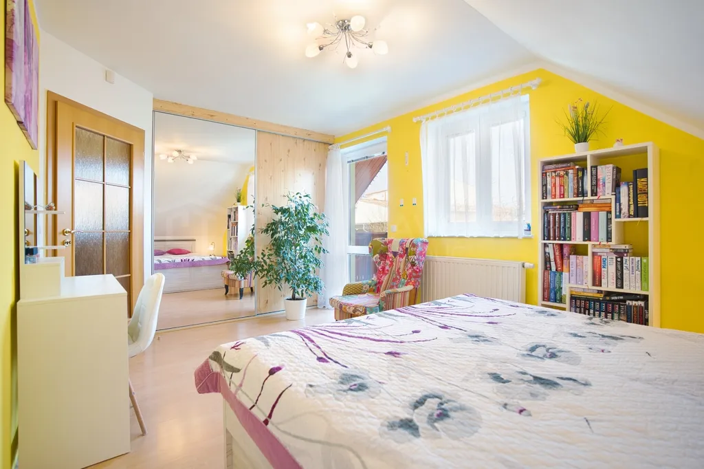Dostatek soukromí pro každého z obyvatel poskytují tři samostatné pokoje v podkroví, přístupném po točitém schodišti. Jeden z nich, využívaný jako ložnice rodičů, má balkon s výhledem do okrasné zahrady.