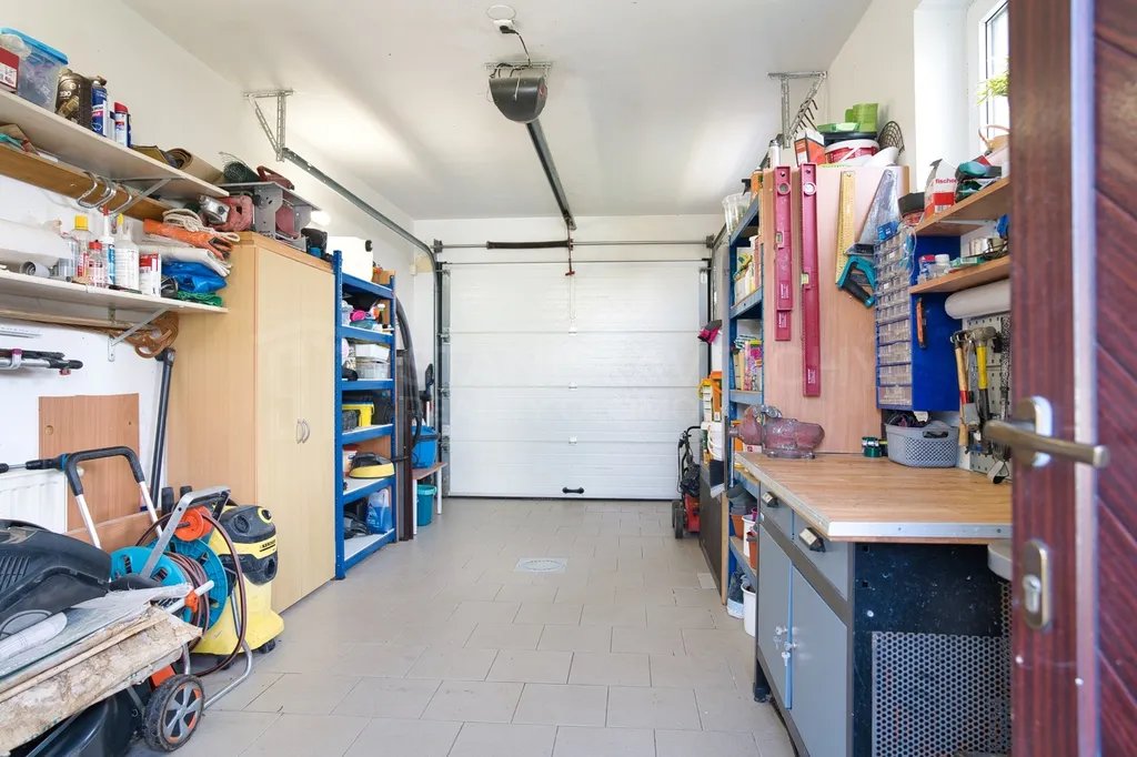 Součástí domu je garáž, aktuálně využívaná jako dílna, možnost parkování poskytuje i uzavřený dvůr. Vjezdová brána i garážová vrata jsou vybaveny dálkovým ovládáním.