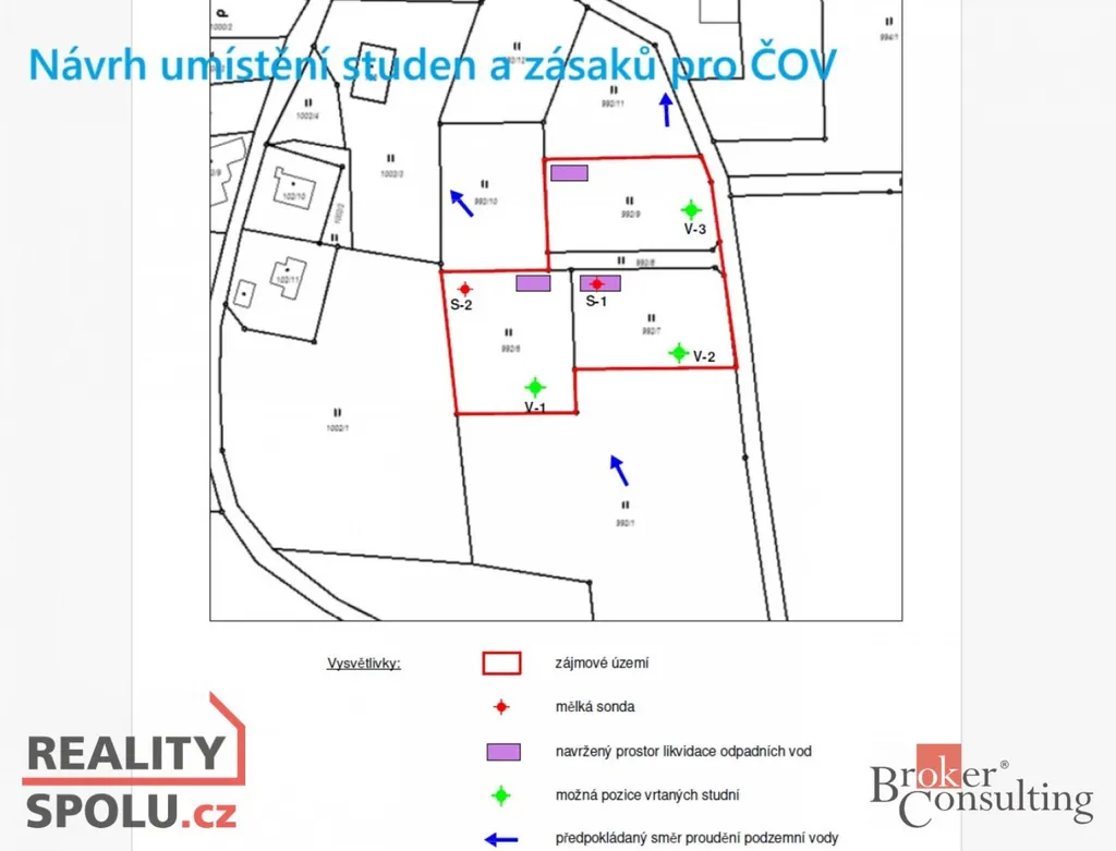 Zdroj vody - vrtaná studna, ČOV + zásak přečištěných a srážkových vod na pozemku.