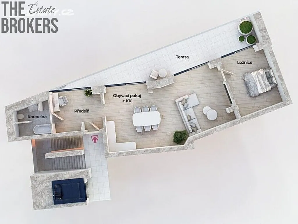 Celková plocha je 99 m² a skládá se z bytové jednotky o dispozici 2+kk (67,4m²) , terasy (24,6 m²) a sklepní kóje (7 m²) . Prostorný byt s přístupem na terasu ze všech pokojů je umístěn v prvním patře. K bytu lze dokoupit garážové stání v podzemních garážích domu.