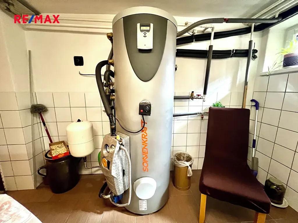 Vytápění domu je ústřední plynovým kotlem, voda se ohřívá v bojleru napojeném na solární panely.