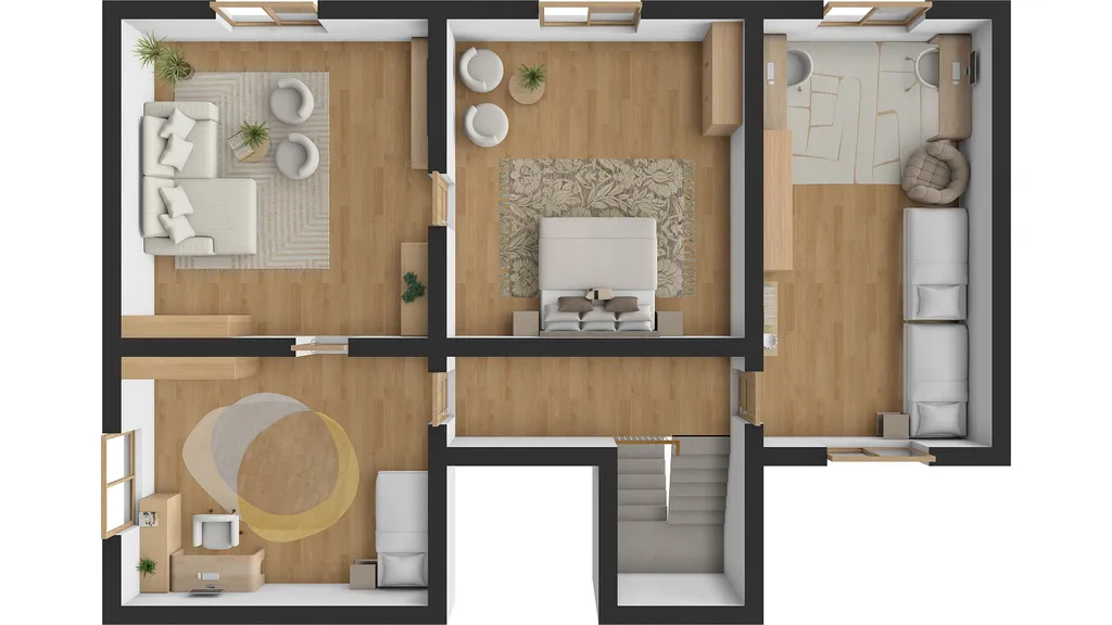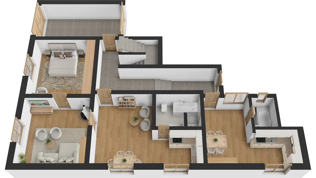 Ze vstupní chodby se dostaneme do obou bytových jednotek. V přízemí domu se nachází bytová jednotka 3+1 s koupelnou a toaletou. Pokoje se dají využít jako obývací pokoj, ložnice a jídelna.