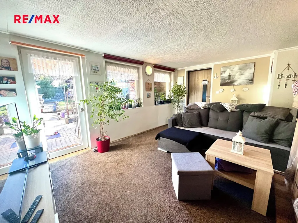Z prostorného obýváku i je přímý vstup na terasu, která je v létě krytá přístřeškem a má výhled na okrasnou zahradu.