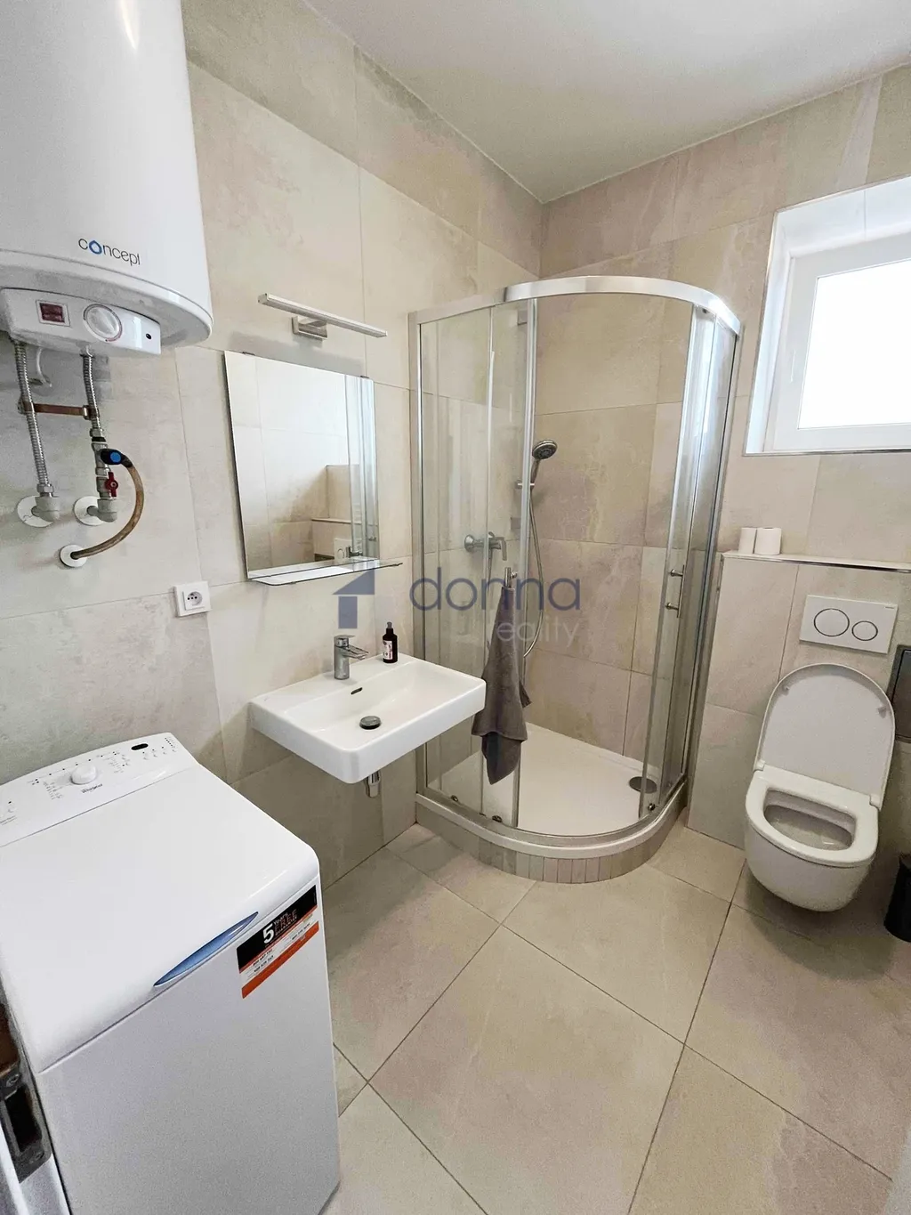 Vybavení: kuchyňská linka s vestavěnými spotřebiči (varná deska, lednice, mikrovlnná trouba, sedací souprava, stůl, židle, skříň, patro na spaní + matrace, prostorná světlá koupelna s oknem a sprchovým koutem, pračkou a toaletou.