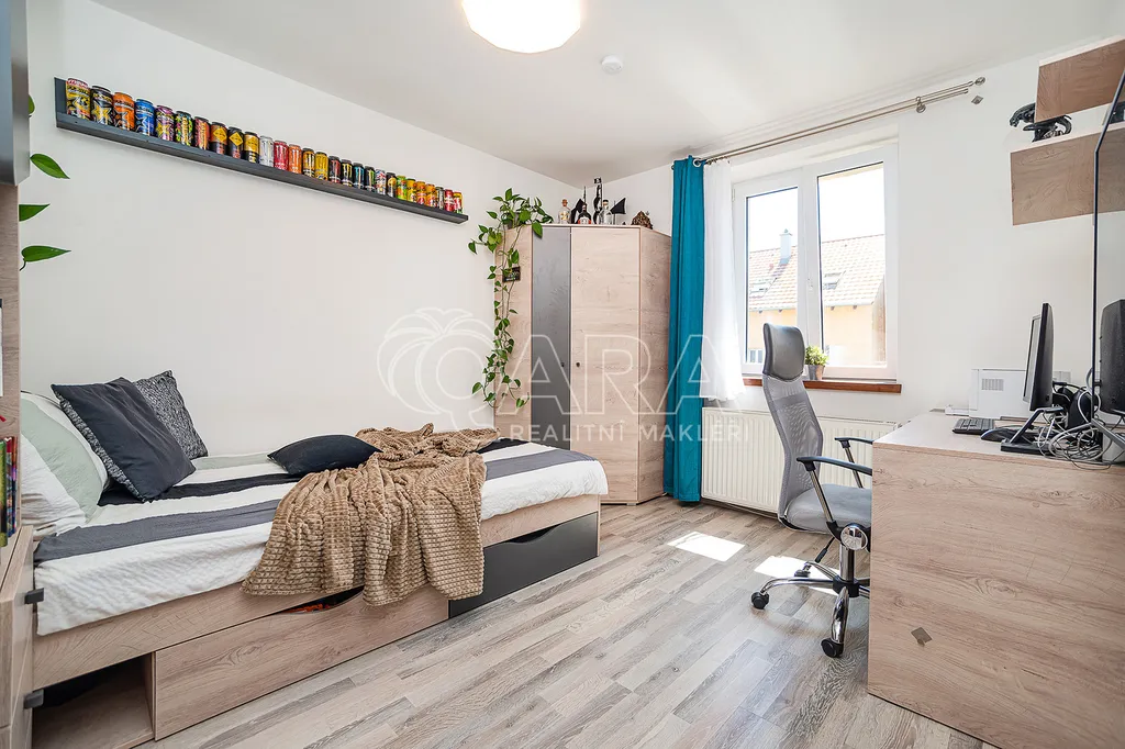 V podkroví se nacházejí dvě menší místnosti se zkoseným stropem, které skvěle poslouží jako tiché pracovny, ateliéry, dětské herny nebo další ložnice.