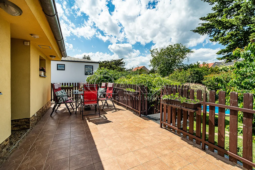 Prostorná terasa s posezením přímo vybízí k odpočinku nebo ranní kávě na čerstvém vzduchu.