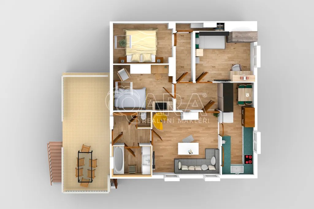 Srdcem bytu je obývací pokoj a samostatná kuchyně s jídelním koutem. Dále zde najdete 3 neprůchozí ložnice, koupelnu, samostatné WC a praktickou šatnu.