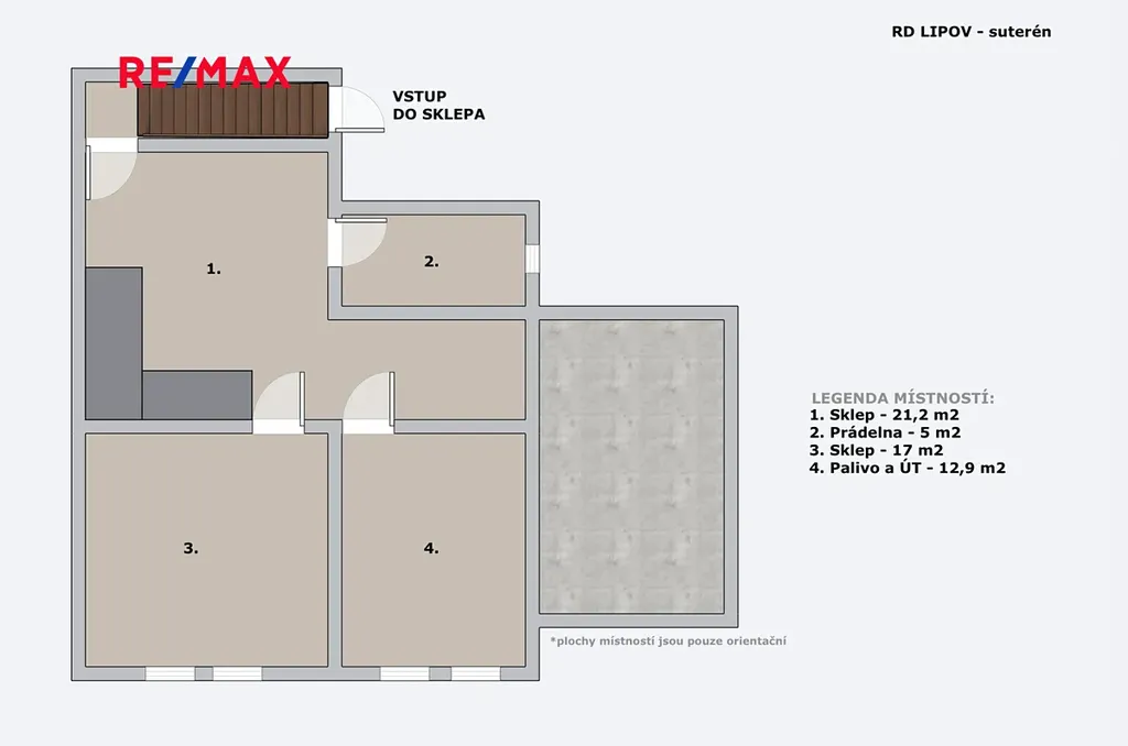 Nemovitost je celá podsklepená. Ve sklepě je umístěn plynový kotel, zásobník na teplou vodu. Do sklepa je možné vejít z haly v přízemí nebo po schodišti ze dvora.