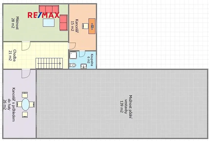 - 1.NP - vstupní chodba, hala 165 m2, místnost 28 m2, kuchyňský kout, sprcha a toaleta,