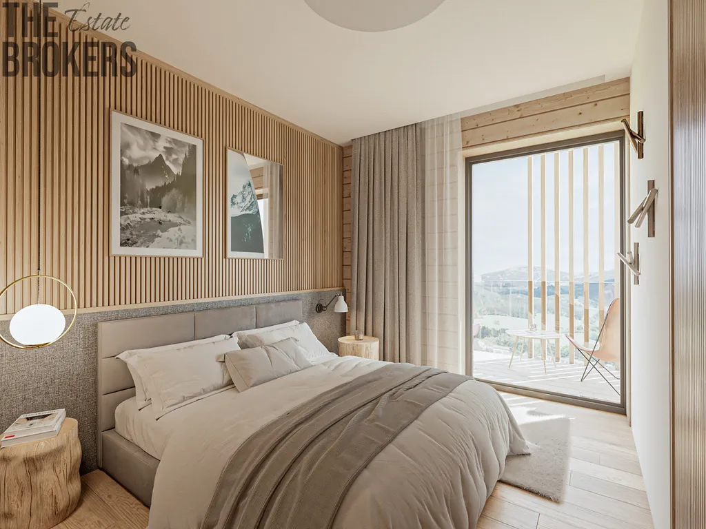 Dispozice apartmánu je navržena s důrazem na pohodlí a praktické využití prostoru. Součástí je prostorný obývací pokoj s kuchyňským koutem, dvě samostatné ložnice, koupelna s WC, vstupní chodba a terasa, která nabízí ideální místo k posezení a relaxaci s výhledem do okolní horské krajiny. Standard projektu zahrnuje podlahové vytápění, napojení na veřejný vodovod a kanalizaci, kvalitní stavební provedení a rezidenční budovu vybavenou výtahem.