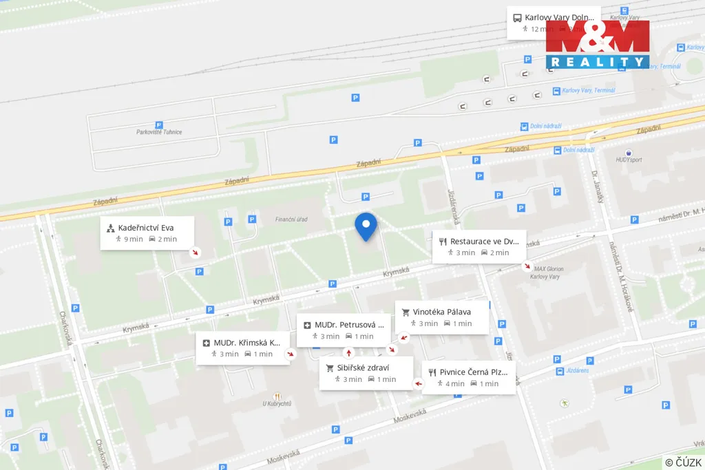 Byt se nachází v Karlových Varech na okraji centra, s výbornou dostupností MHD i pěší docházkou. V okolí najdete vše, co potřebujete pro každodenní život – od obchodů a služeb po kavárny a zeleň. Výhodou je i blízkost lázeňské části města, která dodává lokalitě příjemnou atmosféru.