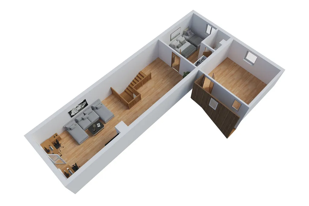 Dispozice domu je funkční a dobře využitelná. V přízemí se nachází obývací pokoj, samostatný pokoj, kuchyně se vstupem do podkroví, koupelna s vanou i sprchovým koutem, samostatné WC a technické zázemí, pracovna/dílna. Podkroví tvoří otevřený prostor, který lze rozdělit na další pokoje, a ložnice s vlastním WC. V patře se nachází samostatná společenská místnost (klubovna) vhodná pro posezení s přáteli, domácí bar či relaxační zónu.