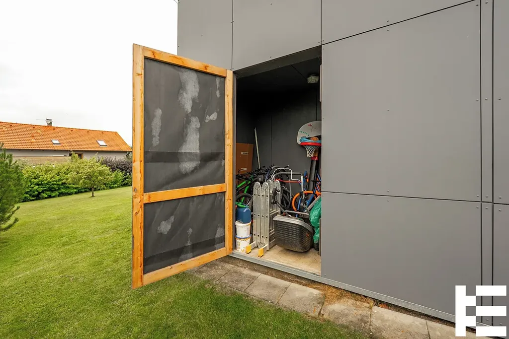 Kuchyňský kout, který navazuje na obývací prostor je vybaven moderní kuchyňskou linkou se všemi spotřebiči. Dominantu prostoru tvoří přiznané dřevěné trámy, které navozují příjemnou pohodu a velká francouzská okna. Z obývacího pokoje je přímý vstup na upravenou zahradu s terasou. Zahrada je po obvodu lemována vzrostlými keři a stromy, které poskytují dostatek soukromí a oddělují samostatně stojící dům od okolí. Fasáda ukývá větší úložný prostor pro nářadí apod.