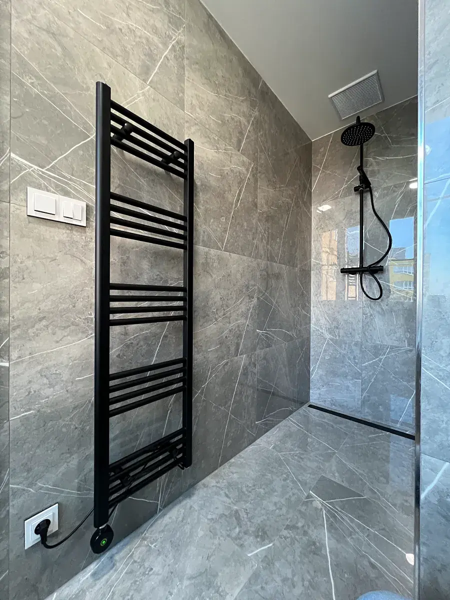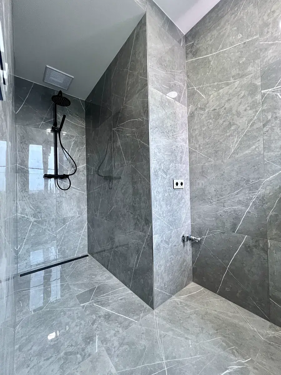 Koupelna nabízí moderní sprchový kout, minimalistické prvky a dostatek prostoru pro každodenní komfort. Je zde příprava na pračku a sušičku.