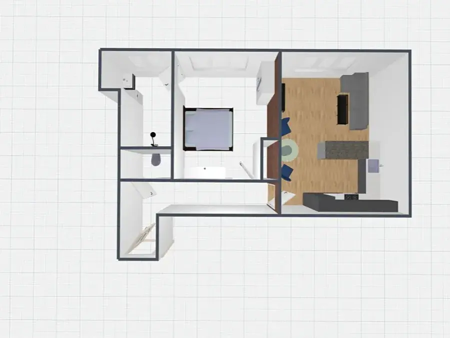 V obývacím pokoji je připravena kompletní instalace pro kuchyňskou linku, která je již navržena naším truhlářem a připravena k realizaci. Není součástí kupní ceny. V levém rohu je vestavěná skříň v bílém matu. V horní části je uložen bojler, spodní část lze využít jako další úložný prostor.