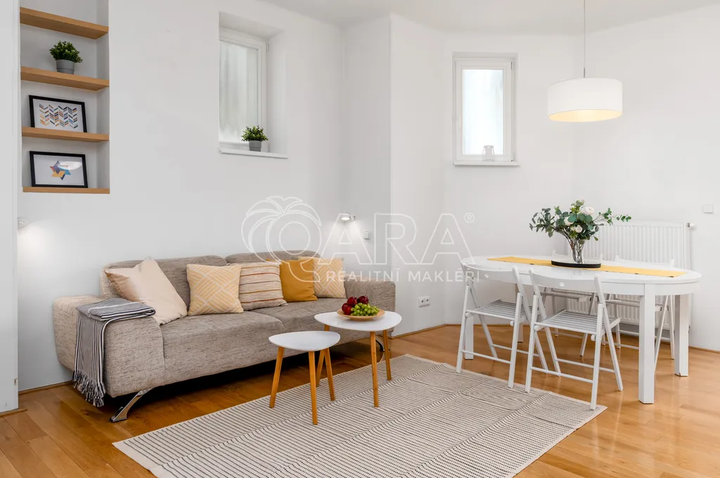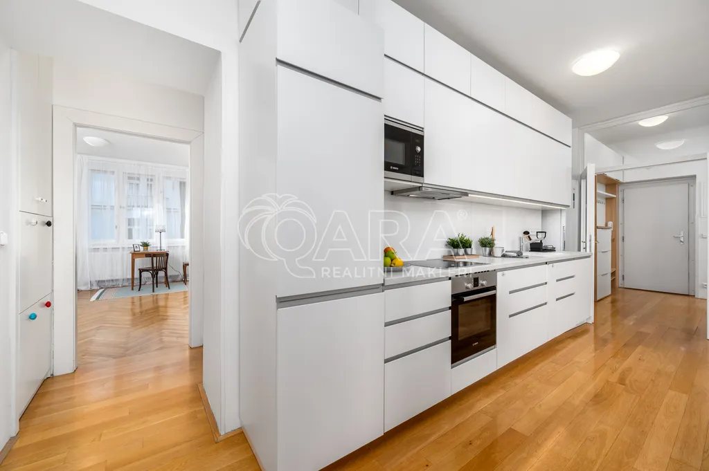 Tento byt prošel přibližně před deseti lety rekonstrukcí, díky níž byla vytvořena moderní a otevřená dispozice, které dominuje obývací pokoj s kuchyňským koutem. Zde se také nachází balkon šikovně orientovaný do klidného vnitrobloku. V zadní části bytu jsou pak dvě samostatné prostorné neprůchozí ložnice a koupelna s vanou, širokým walk-in sprchovým koutem a toaletou.