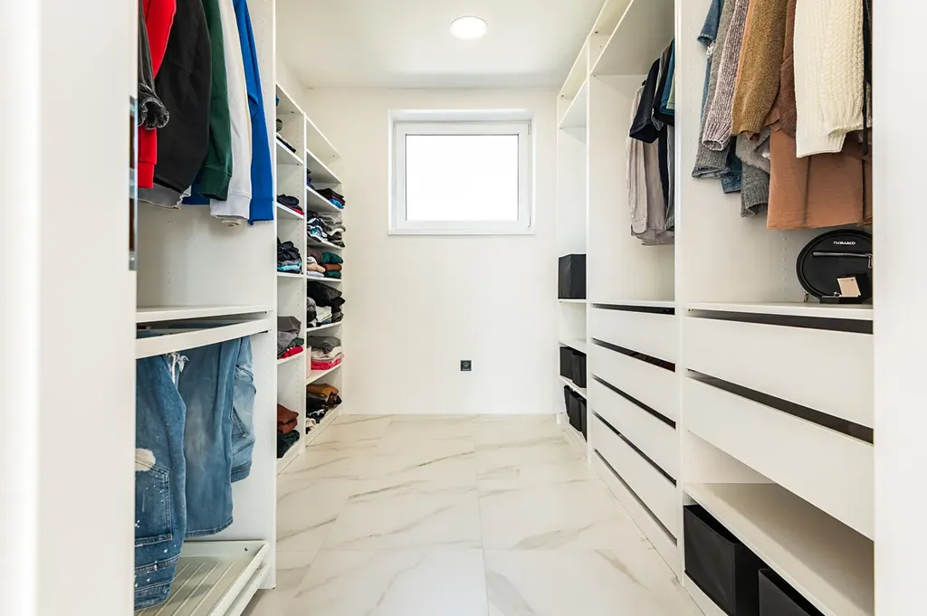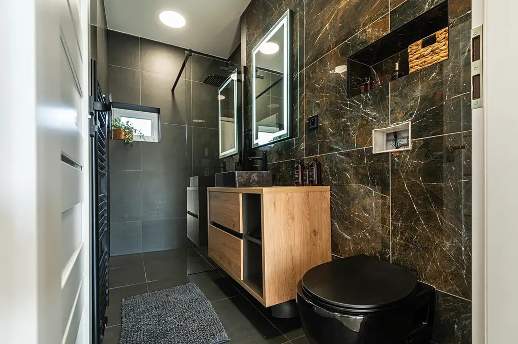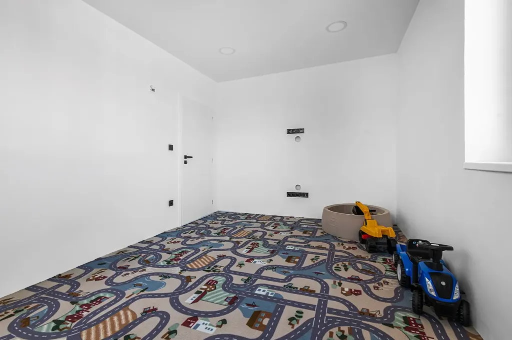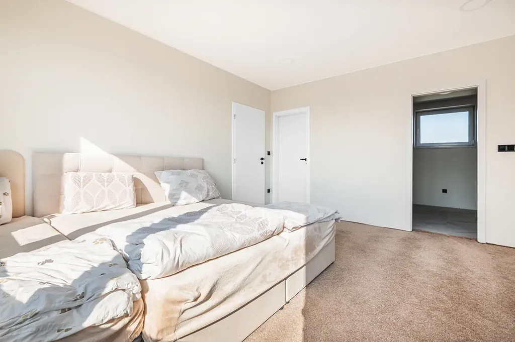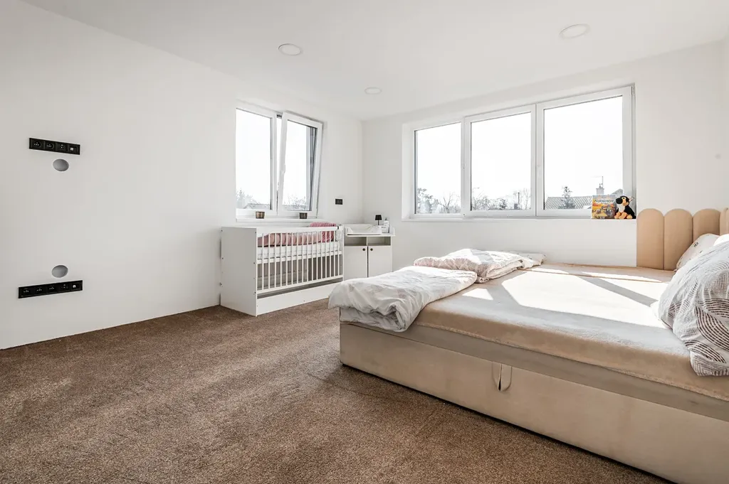V patře se nachází čtyři samostatné pokoje, které nabídnou dostatek prostoru pro děti, pracovnu i hosty. Hlavní ložnice disponuje vlastní koupelnou se sprchovým koutem a šatnou, což zajišťuje rodičům maximální komfort a soukromí. Pro ostatní pokoje je k dispozici třetí koupelna v domě s vanou.