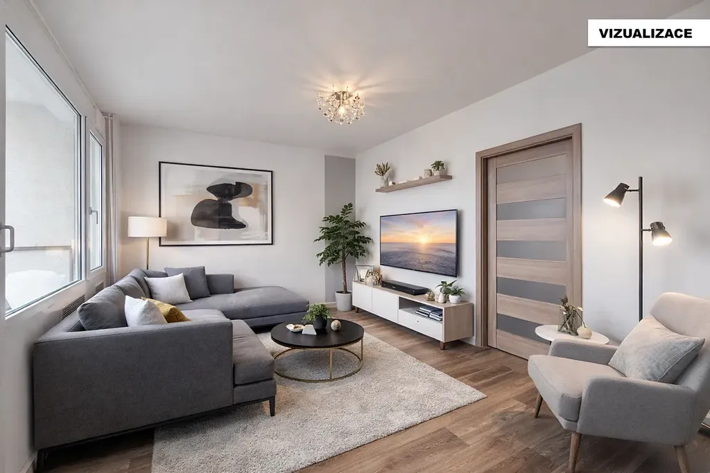 Na kuchyň navazuje prostorný obývací pokoj s lodžií. Oba další pokoje mají samostatné vchody, nejsou průchozí. Ve větším z nich jsou 2 okna.