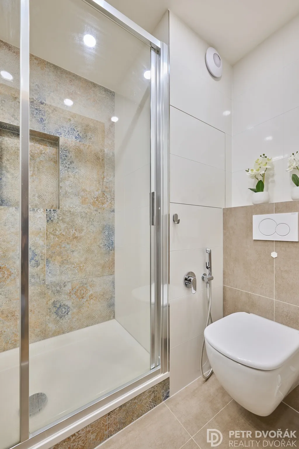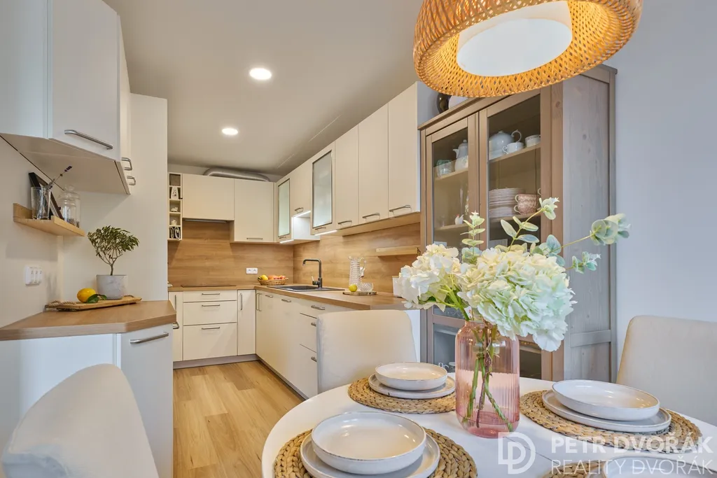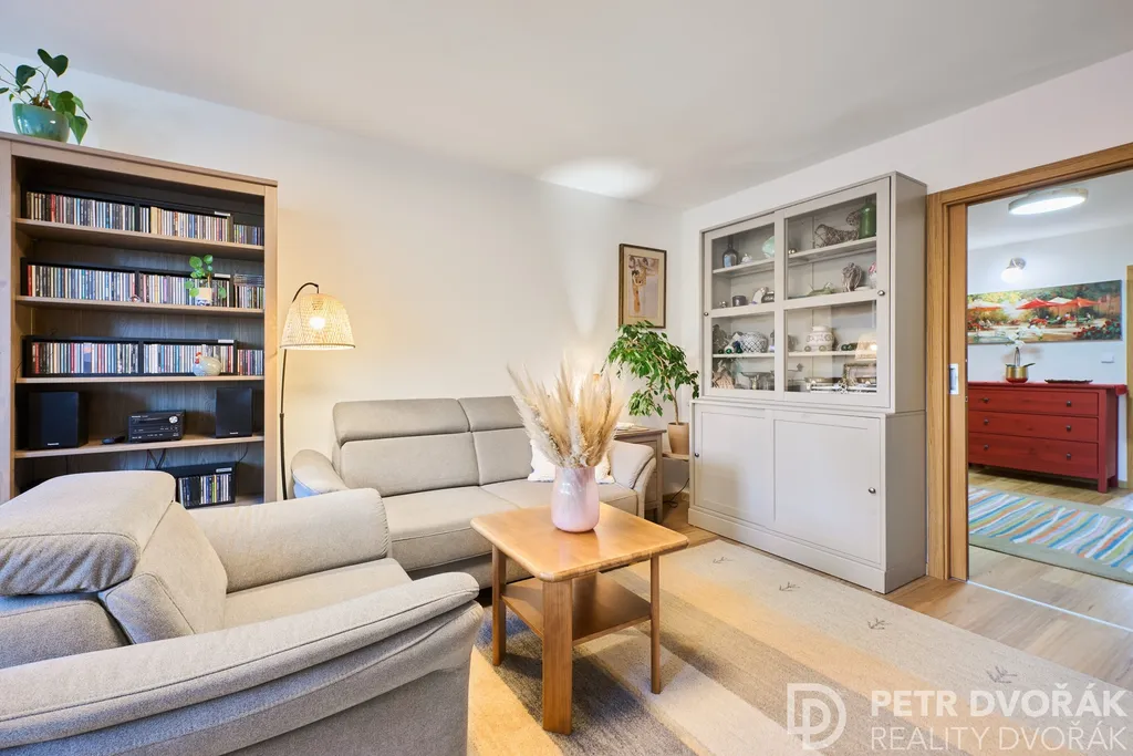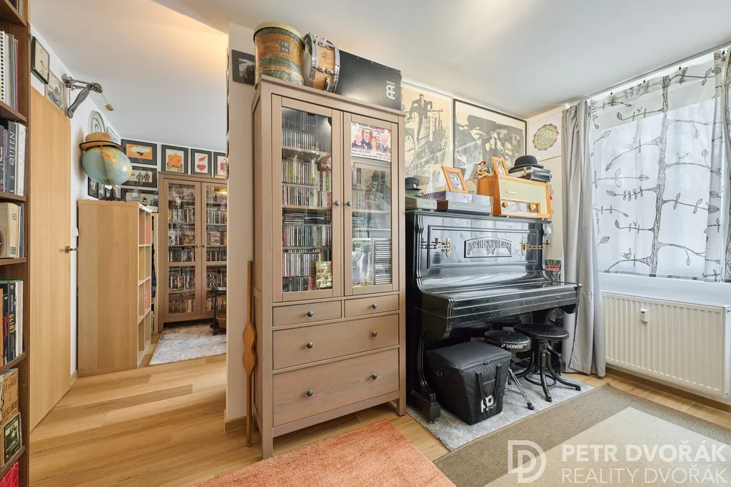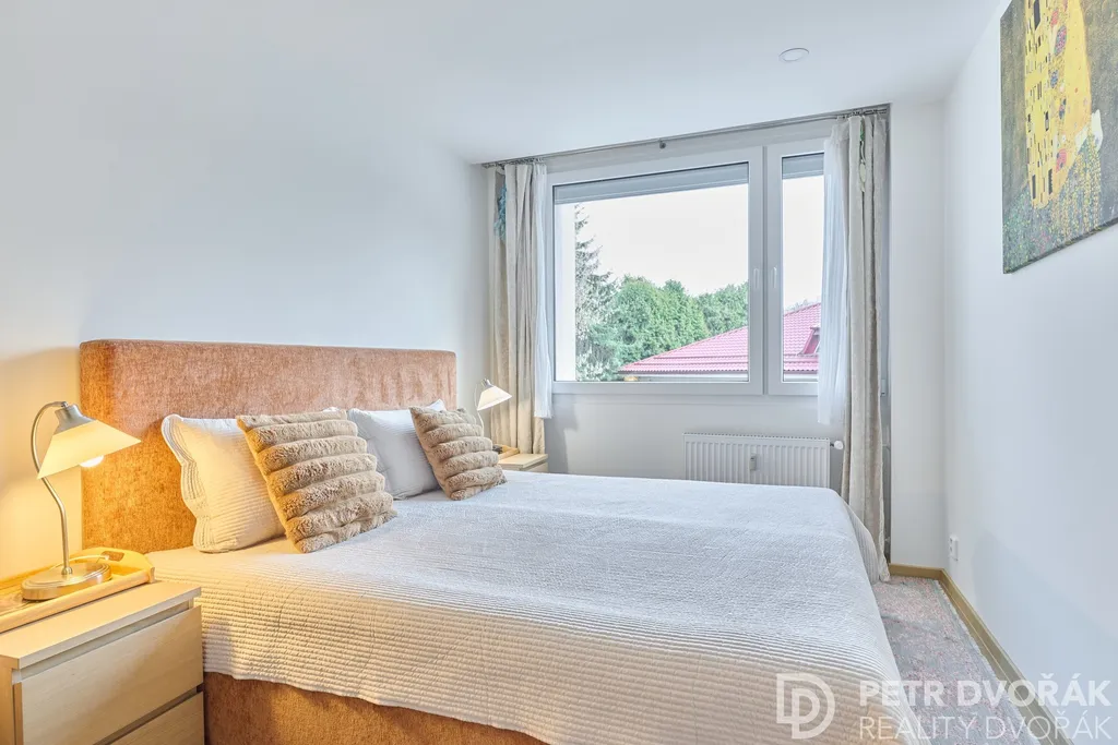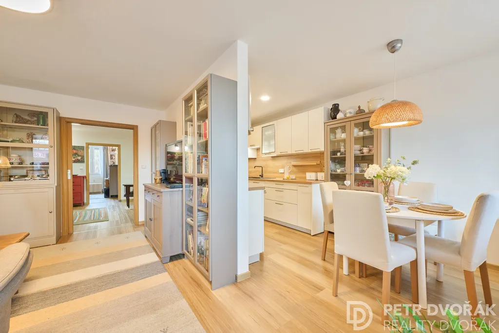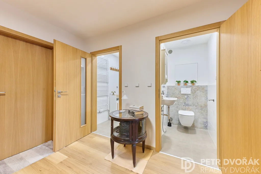 Byt prošel v roce 2024 kompletní rekonstrukcí odbornou firmou — nové rozvody elektřiny a vody, radiátory, podlahy včetně podkladů, kuchyňská linka i spotřebiče. Trojskla jsou vybavena elektricky ovládanými roletami na dálkové ovládání. Akusticky upravené stěny a stropy zajišťují skutečný klid v každé části bytu. Interiér dokreslují dveře z dubové dýhy sladěné s podlahou.