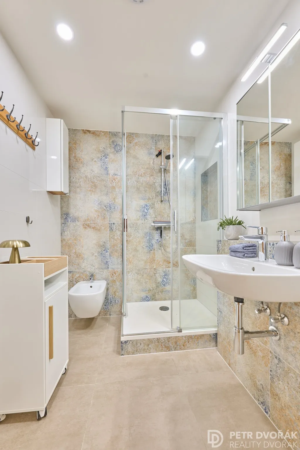 Dispozice přirozeně vytváří dvě samostatné obytné zóny. Jihovýchodní část — obývací pokoj s kuchyní a hlavní ložnicí — je světlý celek s výhledem na zeleň. Severozápadní křídlo se třemi pokoji nabízí klidné prostředí ideální pro práci nebo odpočinek. Obě části spojuje prostorná hala. Byt má dvě koupelny, dvě samostatné toalety, bidet a bidetové sprchy — soužití dvou domácností nevyžaduje žádné kompromisy.