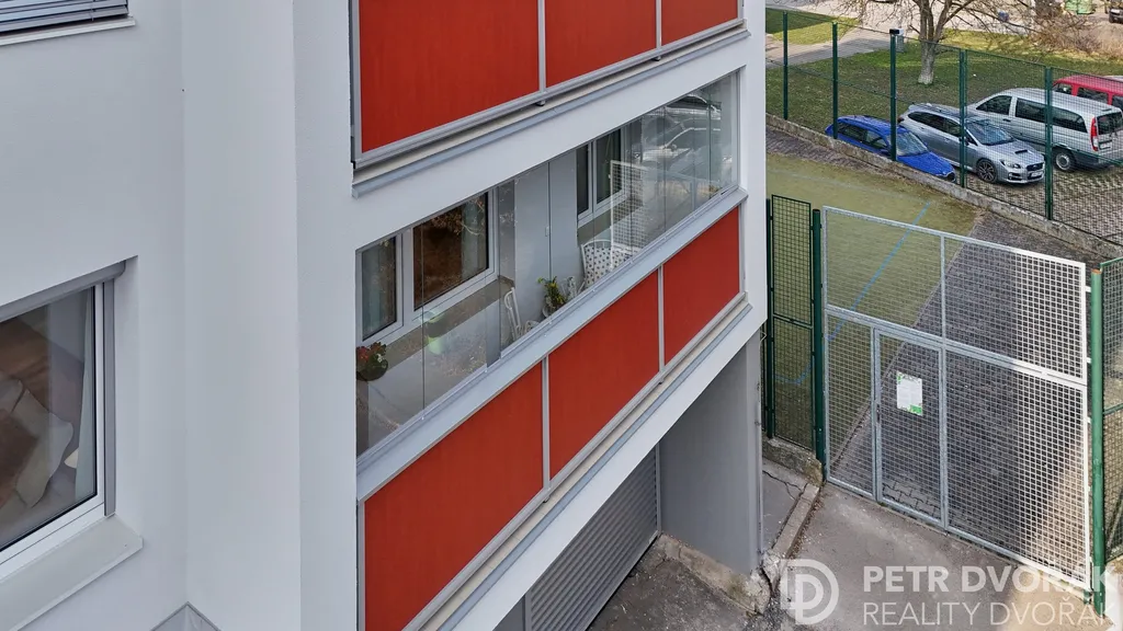 Lodžie 6,9 m² s prosklením a deskami Fundermax je orientována do klidného zeleného dvorního prostoru. Plynová přípojka umožňuje přechod na samostatné vytápění nebo přípravu teplé vody.
