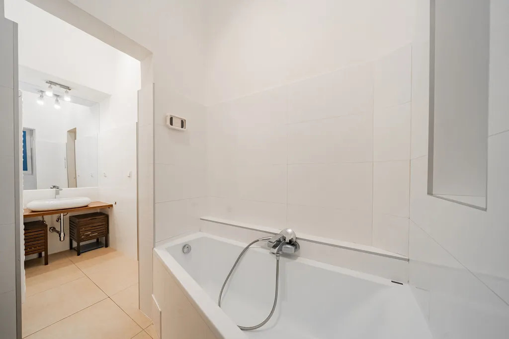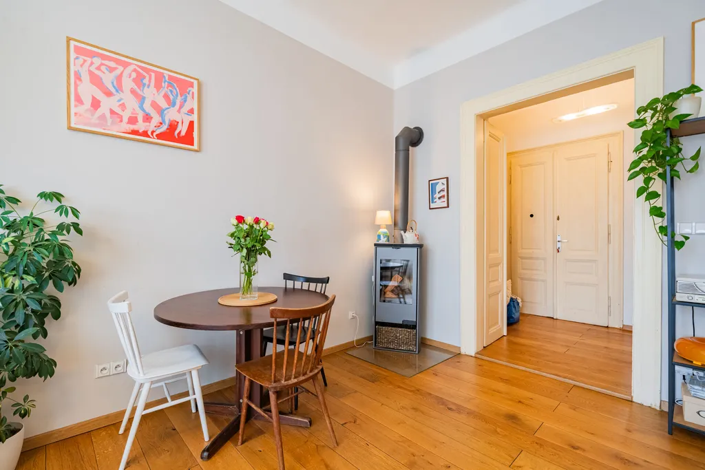 Nabízíme Vám tímto k pronájmu jedinečný byt 2 kk, 55 m2, v klasickém činžovním domě se secesními prvky po celkové rekonstrukci. Byt je umístěný ve třetím patře domu s výtahem. Byt také prošel celkovou, velmi povedenou a vkusně provedenou, rekonstrukcí. Byt má skvělé dispozice. Obývací pokoj se vstupem na balkon je propojený s kuchyňským koutem. Ten je vybaven kuchyňskou linkou na míru včetně spotřebičů. Dále je tu samostatná ložnice se skříněmi a manželskou postelí. V obývacím pokoji zůstává sedací souprava. Koupelna s vanou. Na chodbě bytu je úložná komora. V bytě je poležena kvalitní dřevěná podlaha, která celý prostor velmi zútulňuje. Ohřev vody bojlerem, topení je zajištěno elektrickými přímotopy, ale je možné používat i krbová kamna, což velmi snižuje celkové náklady na topení a navíc zajišťuje neopakovatelnou atmosféru. V domě je výtah a vkusně opravené společné prostory. Pokud chcete důstojné bydlení v širším centru Prahy s dostupností MHD, kompletní sítě obchodů a služeb, tak se jedná o tu pravou nabídku pro Vás.