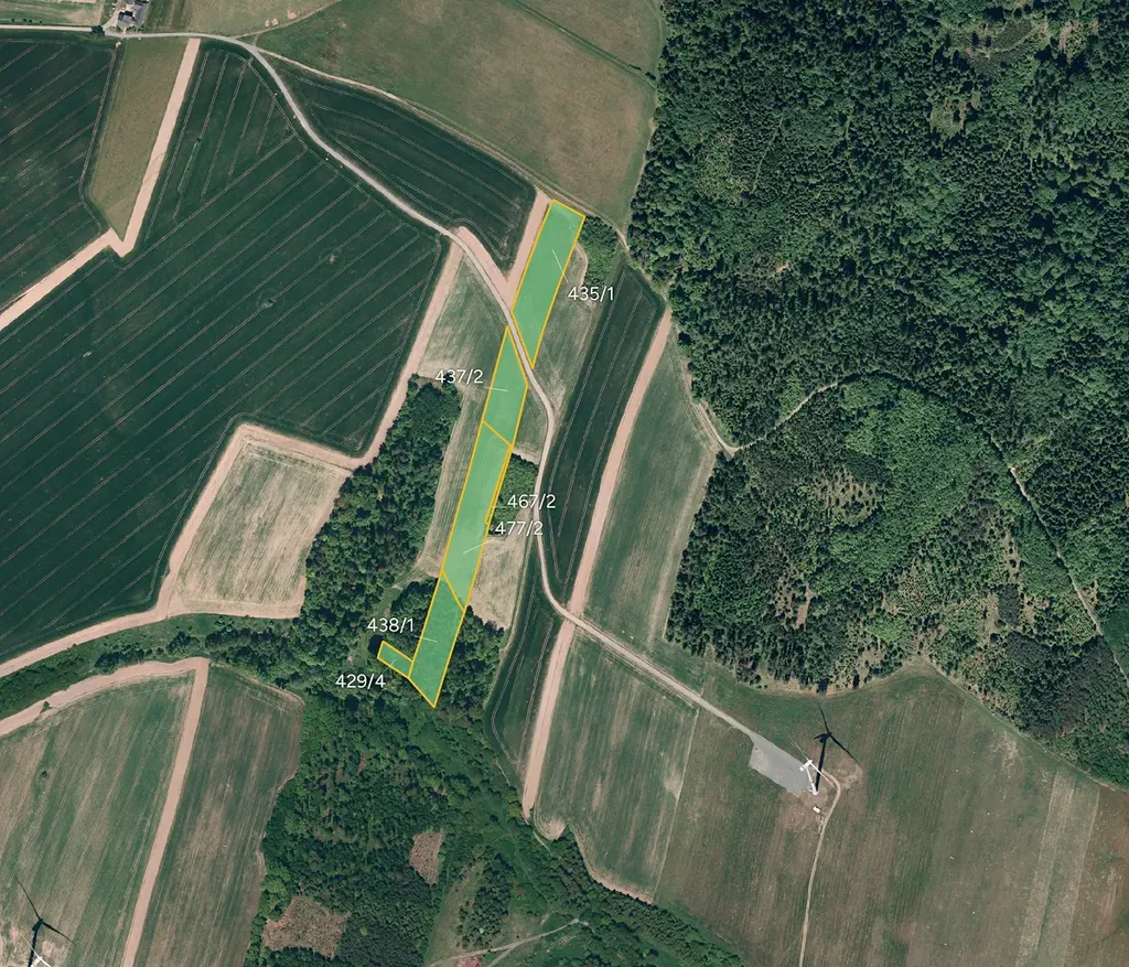 Pozemky zahrnují ornou půdu, trvalý travní porost a lesní pozemky.