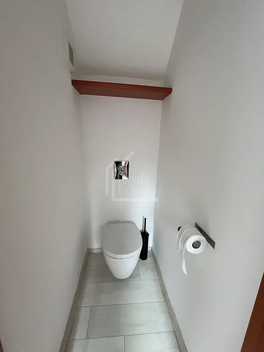 V horním patře se nachází ložnice s vestavěnými skříněmi, koupelna s rohovou vanou, pracovna vhodná jako domácí kancelář a další samostatná toaleta.