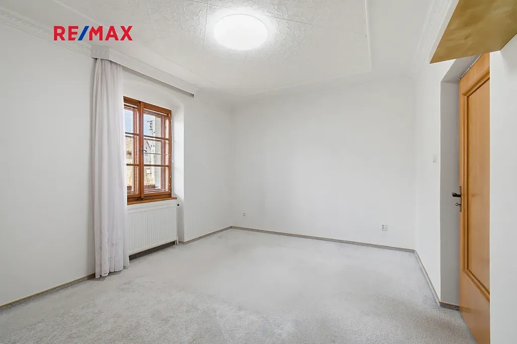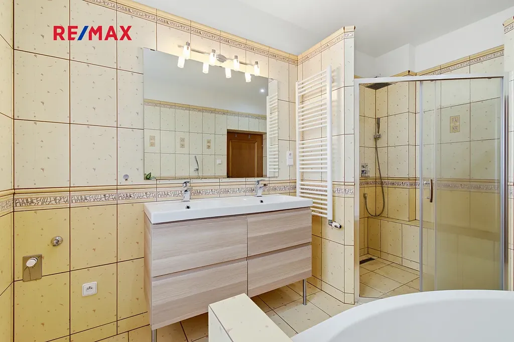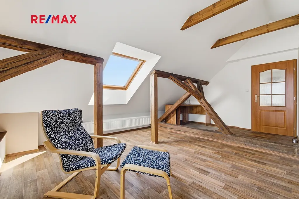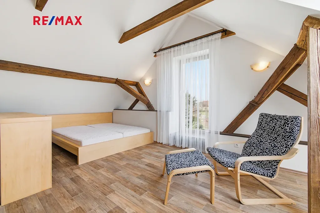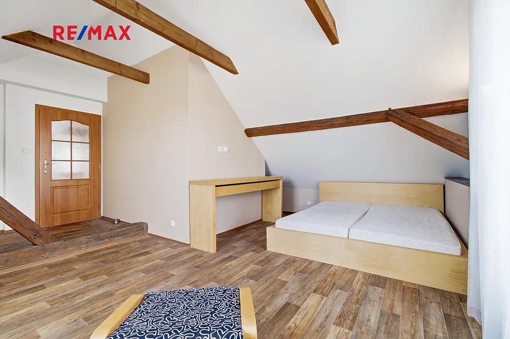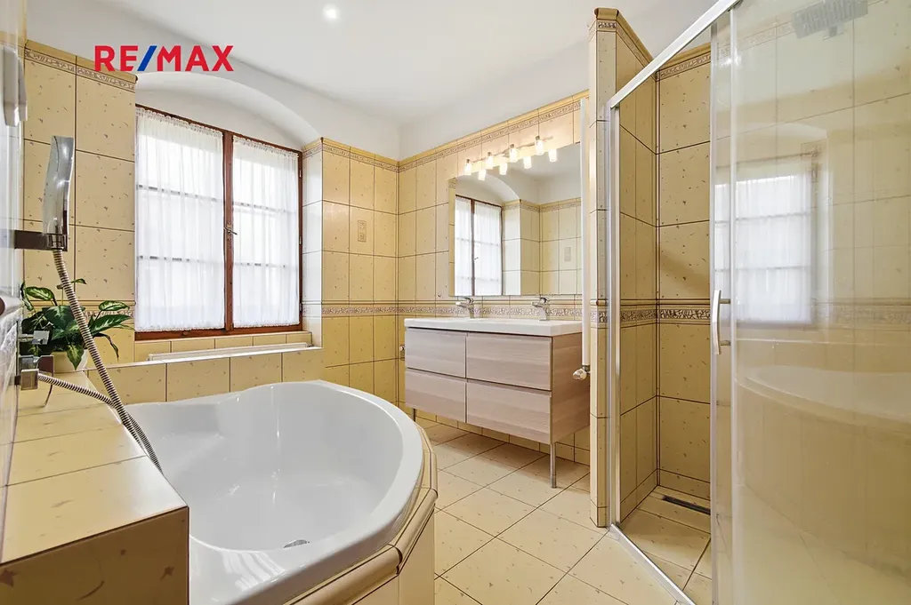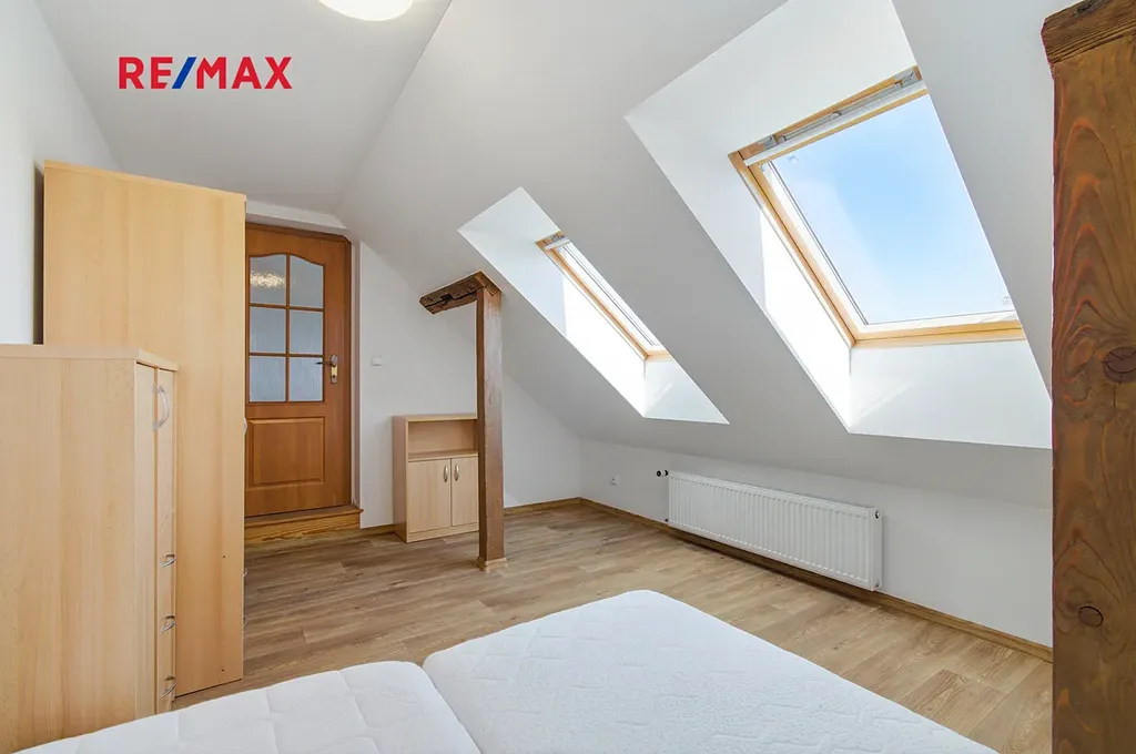 V patře jsou tři neprůchozí světlé a prostorné pokoje, druhá koupelna vybavená vanou a WC. Dům je částečně podsklepen.