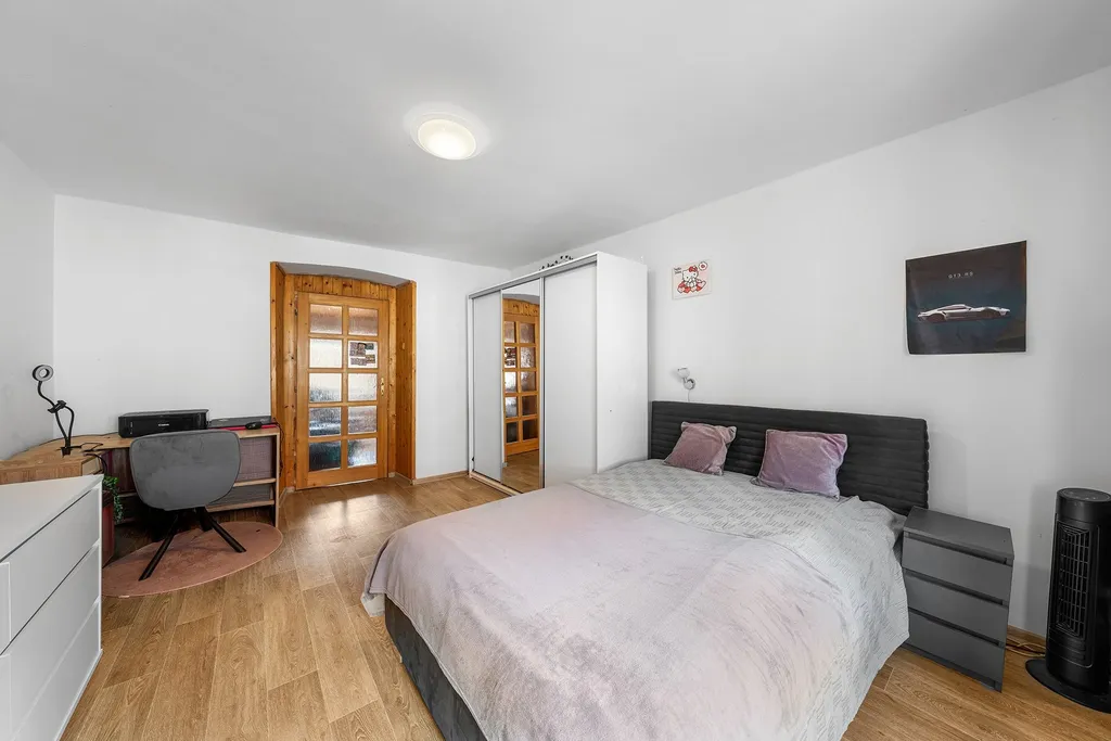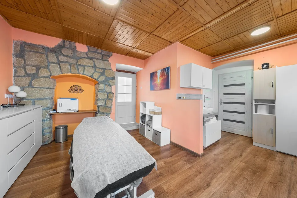 • Přízemí (Komerční využití): Zavedený a plně funkční masážní salon (44,5 m²). Stabilní nájemce a přímý vstup z ulice zajistí okamžitý příjem. Zázemí doplňuje technická místnost/prádelna s plynovým kotlem, který zajišťuje topení v celém domě a historický sklep (10 m²).