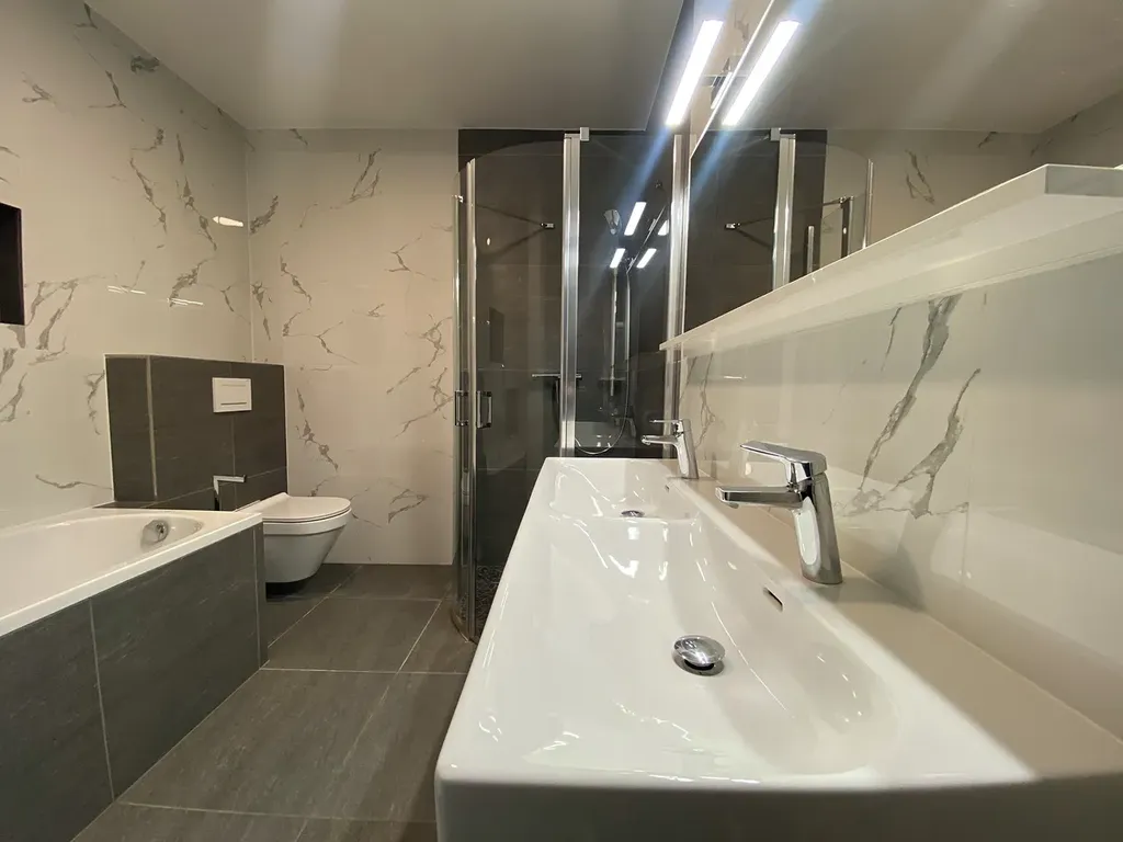 • Koupelna s vanou, sprchovým koutem, dvojitým umyvadlem a WC