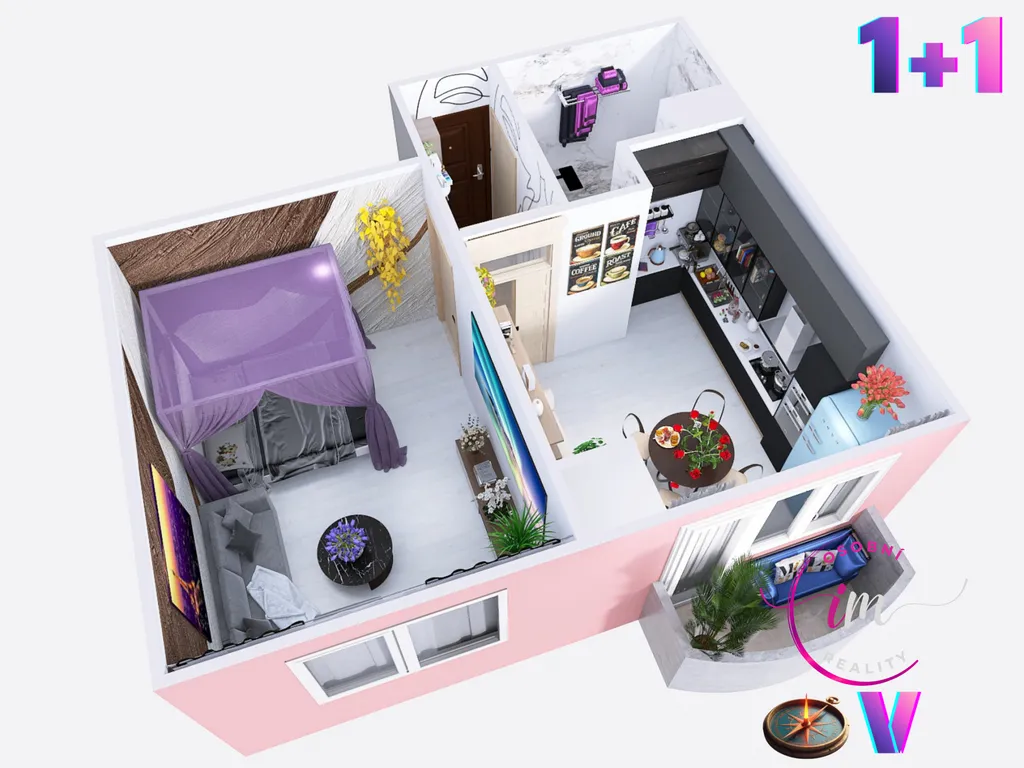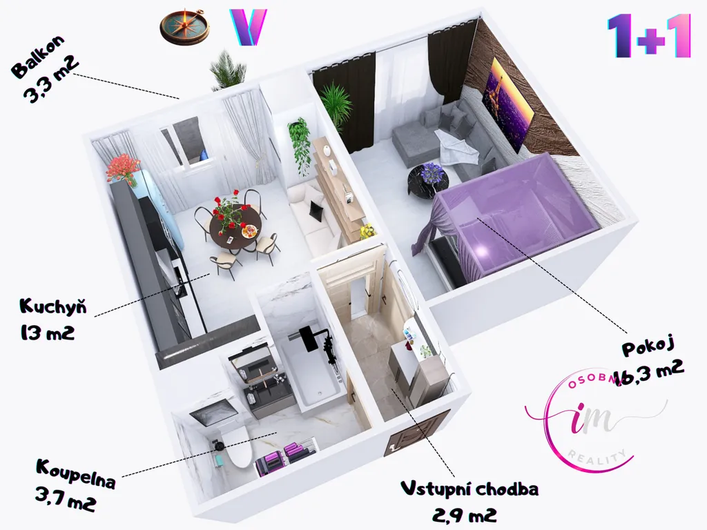 Dispozice 1+1 nabízí dostatek místa jak pro jednotlivce tak i pro pár.