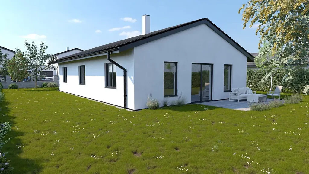 Rodinný dům "ONYX" o rozloze 112,7 m² nabízí moderní a komfortní bydlení. Prostorný obývací pokoj je propojen s kuchyňským koutem, což vytváří ideální prostor pro rodinná setkání a společenské akce. Ložnice je vybavena vlastní šatnou, poskytující dostatek úložného prostoru a zvyšující komfort bydlení. Dům dále disponuje dvěma pokoji, které lze přizpůsobit podle potřeb – mohou sloužit jako dětské pokoje nebo jako pokoj pro hosty a domácí kancelář.