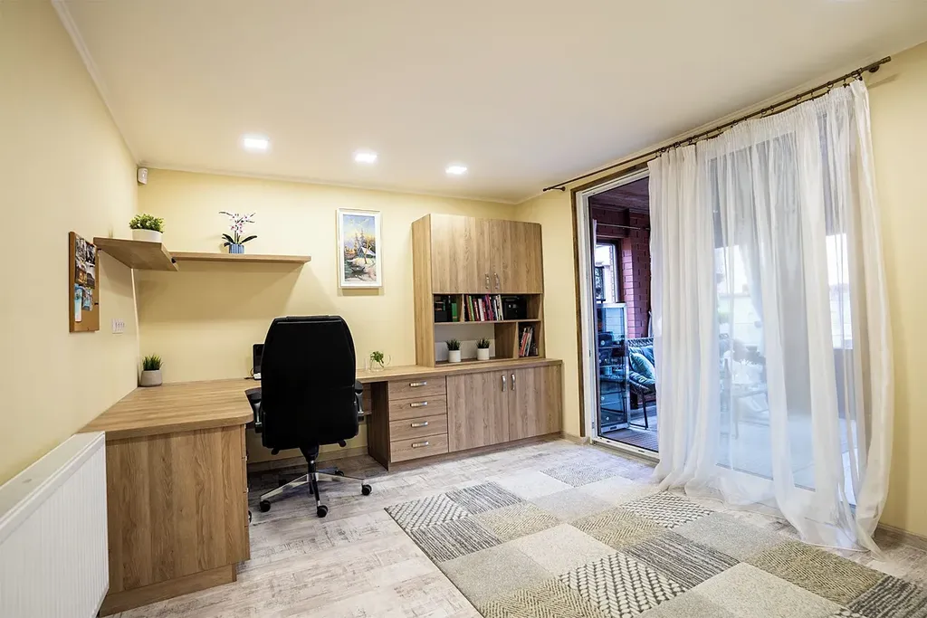 Dispozice: Přízemí - garáž, zádveří, chodba s vestavnou skříní. 1. patro - obývák se schody na rozlehlou terasu, kuchyně, koupelna se sprchovým koutem a wc, ložnice, pracovna se vstupem do zimní zahrady, komora s technickým zázemím, zahrada. 2. patro - ložnice, dětský pokoj, koupelna s vanou a wc