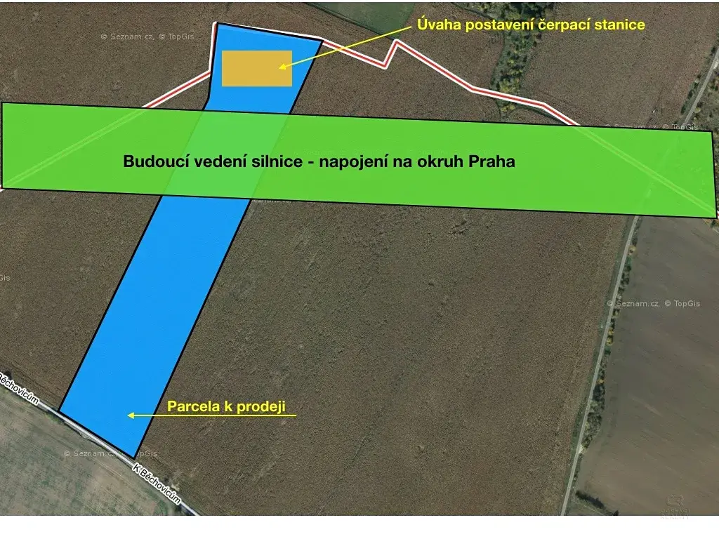 Po výstavbě vedení silnice, která bude navazovat na Pražský okruh bude mít prodávaná parcela výměru 18990m2. V prezentaci fotek je stručný nákres vedení budoucí cesty a možná úvaha, kde by mohla stát čerpací stanice.